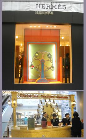 地上に巨大な観覧車・・・のブームもひと段落かと思ったら、最近は、お店のディスプレイなどでもよくみかけるようになった。 マカオのマンダリンオリエンタルの庭から見た、有名ブランドのお店。 ショーウィンドには、なんとまあ、おしゃれな観覧車が・・・。 ブランドイメージにもよく似合い、上品なカラーリングである。 いよいよ店頭ディスプレイにも登場かと思っていたら、翌日香港のセントラルにできたショッピングモールでも発見。 これはクリスマスプレゼントキャンペーンのブースのディスプレイ。 観覧車は縁起がよいのであろうか? やはり人に幸運をもたらす印象があるのであろうか? みつけた人は自然とそちらを注目し、近寄ってくる。 大きさはともかくとして、アイキャッチとしての効果があるようだ。
