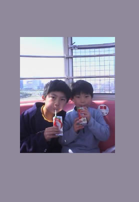 春の休日、お台場へ行き、家族で観覧車に乗りました。 これは頂上付近の1枚です。すっかり喜んでいわが子、隆平と康輔です。携帯で思わずとったワンショットです。