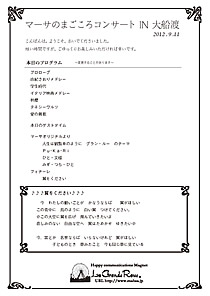 ああ、がんばらねば。リハーサルを終え、本番に。会場である蔵ハウスは老人福祉施設であるため入居者の皆さん、スタッフの皆さん、地域の皆さん、そして東京からの応援団も・・・たくさん集まっていただいた。 そして懐かしい名曲から、オリジナル曲までたっぷり演奏させていただき、その日のために構想していた新曲「レクイエム11」も初演奏。思いを込め、演奏させていただいた・・・。トークやクイズも交え、笑いあり、涙ありで予定の時間を過ぎる。