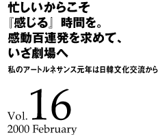 韓国文化院へ久しぶりに伺った。日韓の漫画家たちによる「年賀状交流展」というイベントを開催していた。文化官の方の話によると、日韓交流のイベントは年々増えており、日韓の両国では毎日のように何かしら行われているそうだ。そういえば友人の画家も、日韓交流展というグループ展に出展したと話していた。いろんな作品を通じて、ツール、メディアを通じて、もっともっと理解し合いたい。感動を分かち合いたい。さて、私、2000年はこれらを皮切りに、仕事の合間を縫って『ひとり感動ツアー』を実行している。すばらしい出会いと感動。これは自ら出かけなければ何も得られない。2000年も感動を追いかける旅に夢中のようだ。